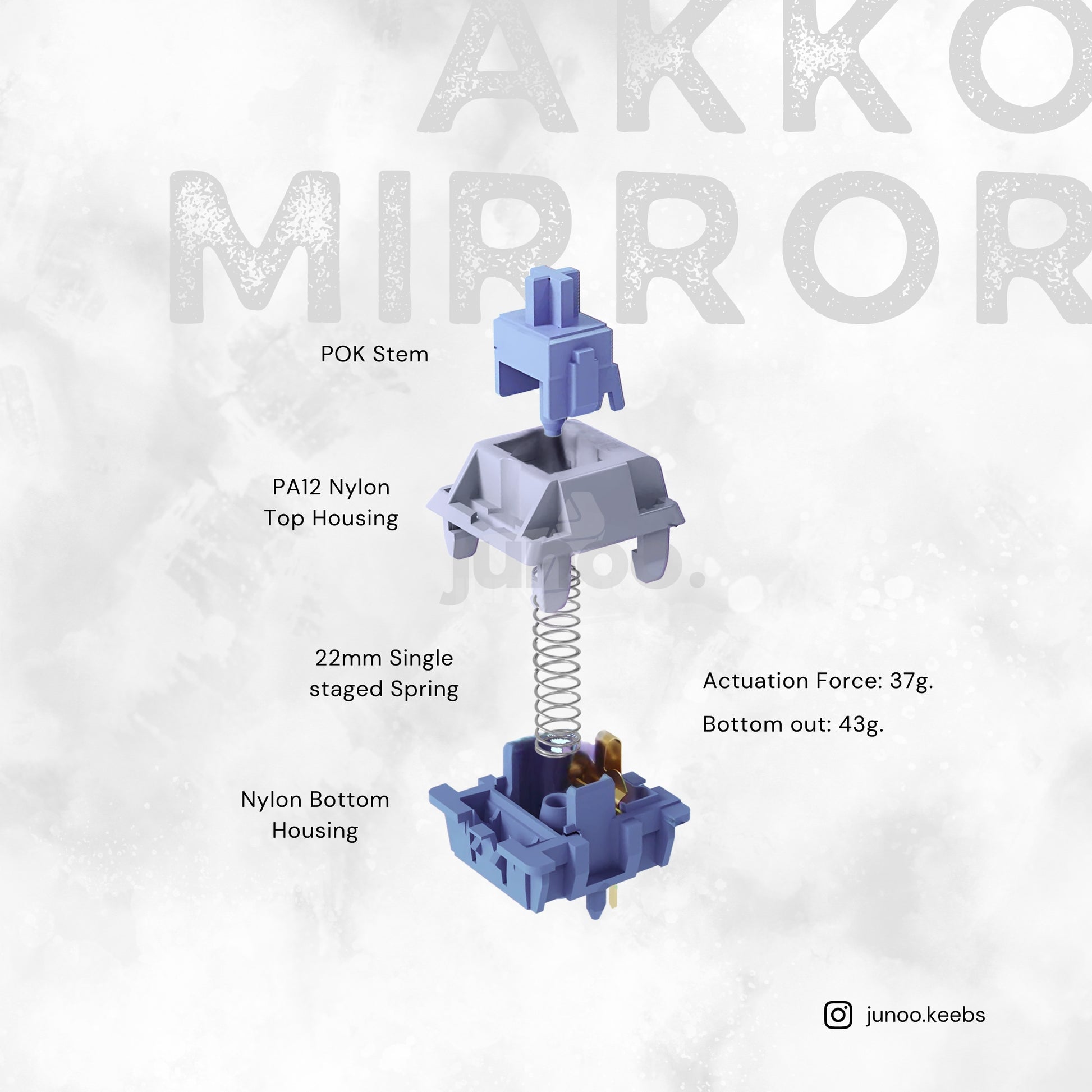 The Akko Mirror Switches are engineered to produce a crisp, high-pitched clack, thanks to their long-pole stem design. This design choice enhances the switch's ability to convey the keyboard's natural acoustics, making them ideal for users seeking a vivid and expressive typing experience. The factory lubrication ensures smooth keystrokes, while the tight housing tolerances minimize stem wobble, contributing to a consistent and satisfying feel.